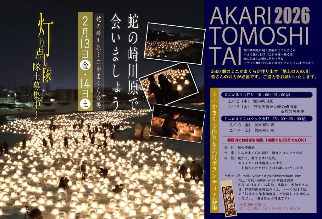 2026 0115【地上の天の川】間近で全貌を観てみませんか? Post Share Line RSS Pin it note この記事のタイトルとURLをコピーする横手の冬にだけ現れる約3,500個のミニかまくら。 1.5キロにわたって続く光の道は、まさに“地上の天の川”。 The自由庵の2階から、その奇跡の景色をゆっくり眺めてみませんか。 Post Share Line RSS Pin it note 年末年始の休業のお知らせ前の記事